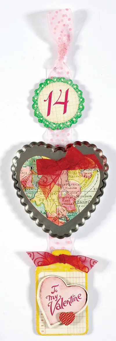 Make a loop in one end of 12” of 3/4” wide pink sheer dot ribbon. Place the map chipboard heart at the center of the tin. Glue a red sheer bow to the top of the heart.