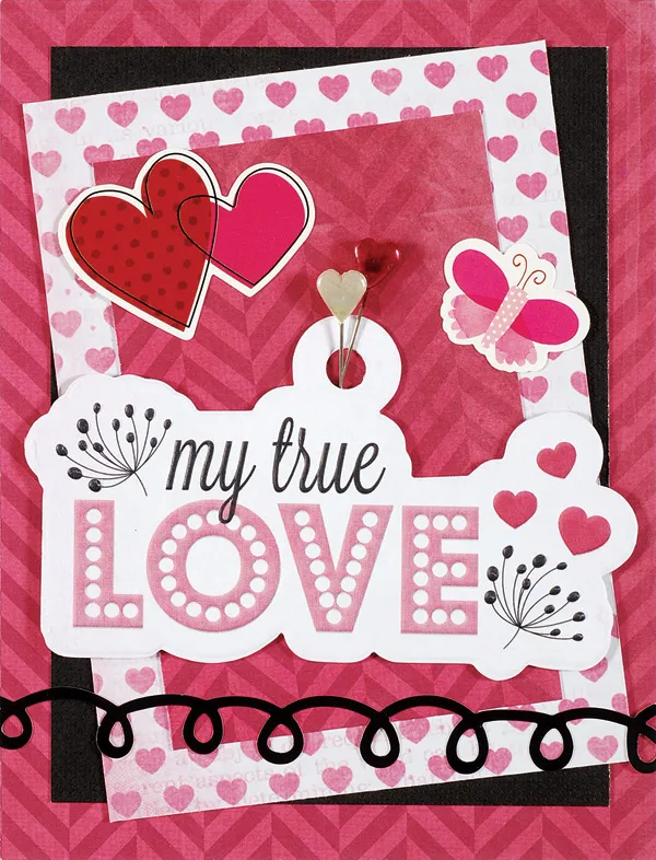 Foam tape the greeting embossed tag centered below the middle of the card. Place black loops sticker below the greeting. Place a two hearts sticker above the greeting, on the left. Place a butterfly sticker to the right. Push a red heart pin through the tag hole and slightly bend up. Push a white heart pin through and bend it.