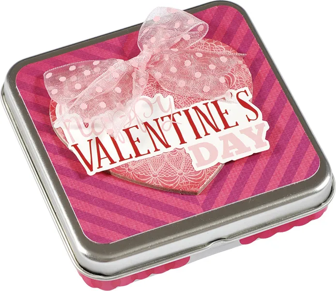 Adhere lengths of a sticker border around the outside bottom edge of the tin, making a break at the opening and the hinges at the back. Corner round the remaining striped piece and glue to the lip top. Place a large chipboard heart at the center and “Happy Valentine’s Day” sticker at the heart center. Top with a pink dot bow.
