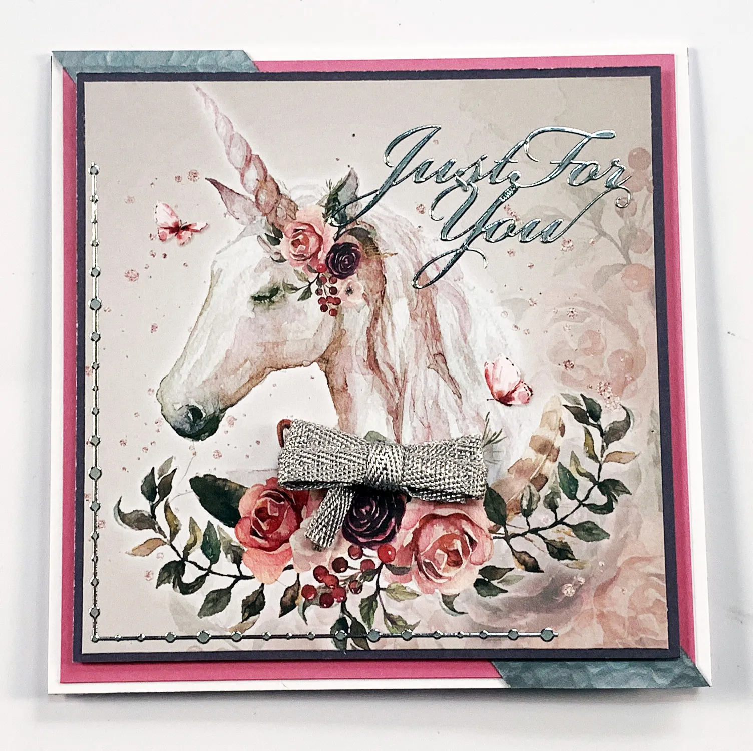 From the 8”x8” Paper Pad select the large unicorn sheet and cut to 4 3/4” square around the unicorn. Mat on dark gray Matt-Tastic Adorable Scorable with 1/16” border. Foam tape to the card. Place “Just for You!” Greeting Dazzles™ in the top right corner and Fancy Border Dazzles™ to the lower left corner. Zot™ a 1 1/2” wide silver bow as shown.