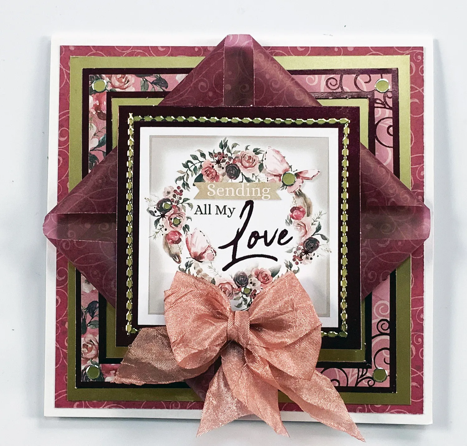 Cut the white card to 5” square. Cut 4 4/8” square of Metallic Gold Specialty paper and mat on the burgundy swirl (from the 8”x8” Pad) with 1/8” borders. Glue to the card leaving a white card border.
