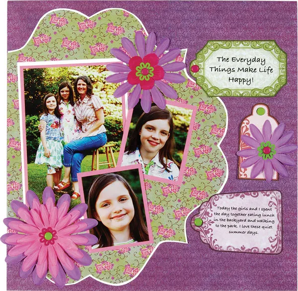 Layer the pink and purple silk flowers and secure with flower Brad Buddies™ and pink or green brads, at the lower left and upper right photo corners.