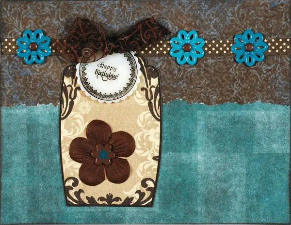 Secure blue and aqua blue mini flower brad buddies™ to the left and right sides of the brown dot border cut-out, leaving space at the center for the tag. Glue the border across the card, ¾” from the fold. Glue the tag to the left side of the border.