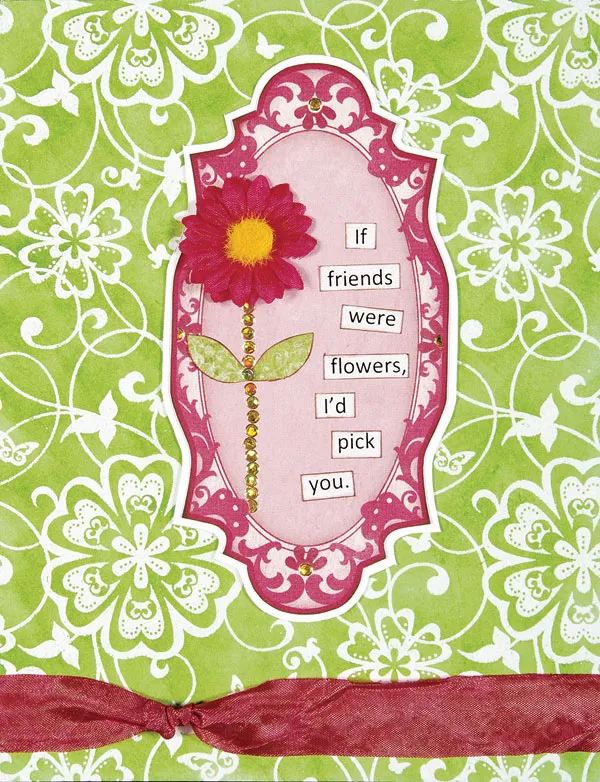 Color the Color Me floral paper with the green inkpad. Cover the card front with the colored paper. Tie a knot in the burgundy ribbon and glue across the front of the card front, ½” from the bottom. Trim the edges.