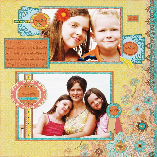Write or computer print journaling on orange textured paper, trim to a 3 ¼”x2” and ink the edges. Mat on aqua patterned paper leaving a 1/8” border and ink the edges. Glue to the page, overlapping the 6”x4” photo, 3” from the top and 3/8” from the left side.