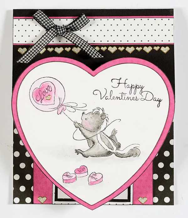 Remove the hearts from the squares. Cover the large heart with Colorist pink dots paper and ink the edges black. Cover the medium heart with black cardstock and the small heart with Colorist pink dots paper. Ink the edges of the pink heart black. Glue each heart point to the matching card heart point.