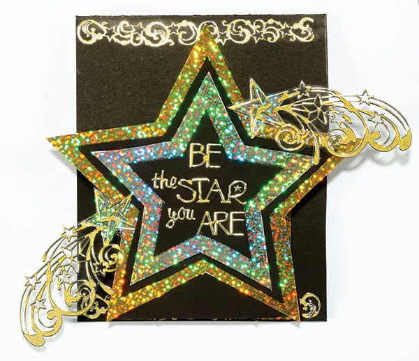 Trace and cut a large star from white cardstock. Cover with the gold glitter sheet, making a break at a “V&rdquo,; and not on a point.. Trace and cut a medium star from white cardstock. Cover with silver glitter sheet. Mat with foam tape on black cardstock, with 1/8” borders.. Trace and cut a small star from black cardstock. Place the Dazzles™ words as shown, and foam tape centered. Back the star part of the two shooting star Dazzles™ with silver glitter sheet. Cut close to the Dazzles™ edge. Back both shooting star Dazzles™ with acetate. Cut close to the Dazzles™ edge. Glue of the star to the top right corner, and one to the bottom left corner. Glue the large gold star to the large base, with bottoms even.