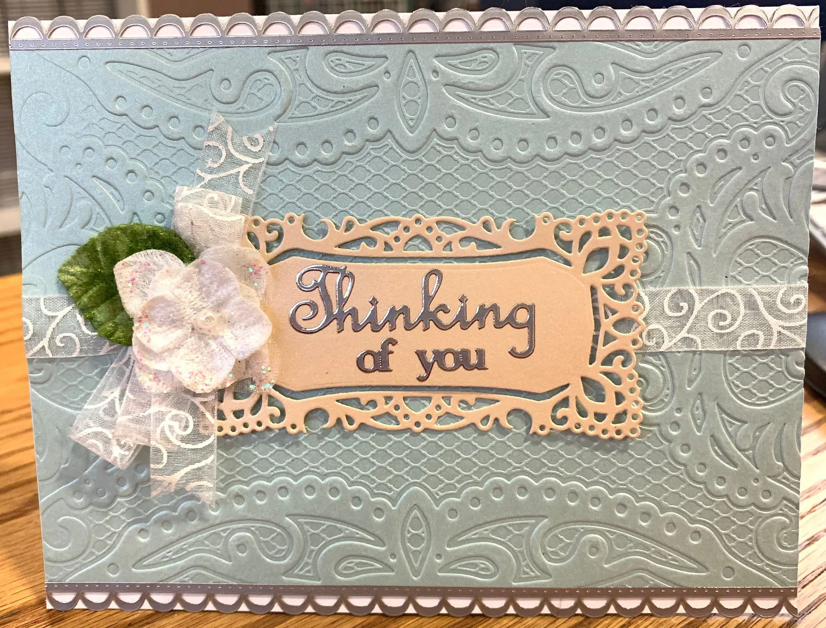Die cut a 3¾"x2" frame from Tan Pearl cardstock and foam tape it to the center front. Place silver “thinking of you” Dazzles™ in the frame center. Make a 4-loop bow with the same sheer ribbon and tie the center with thread. Glue it overlapping the left end of the frame. Glue a flower and leaf over the bow center.