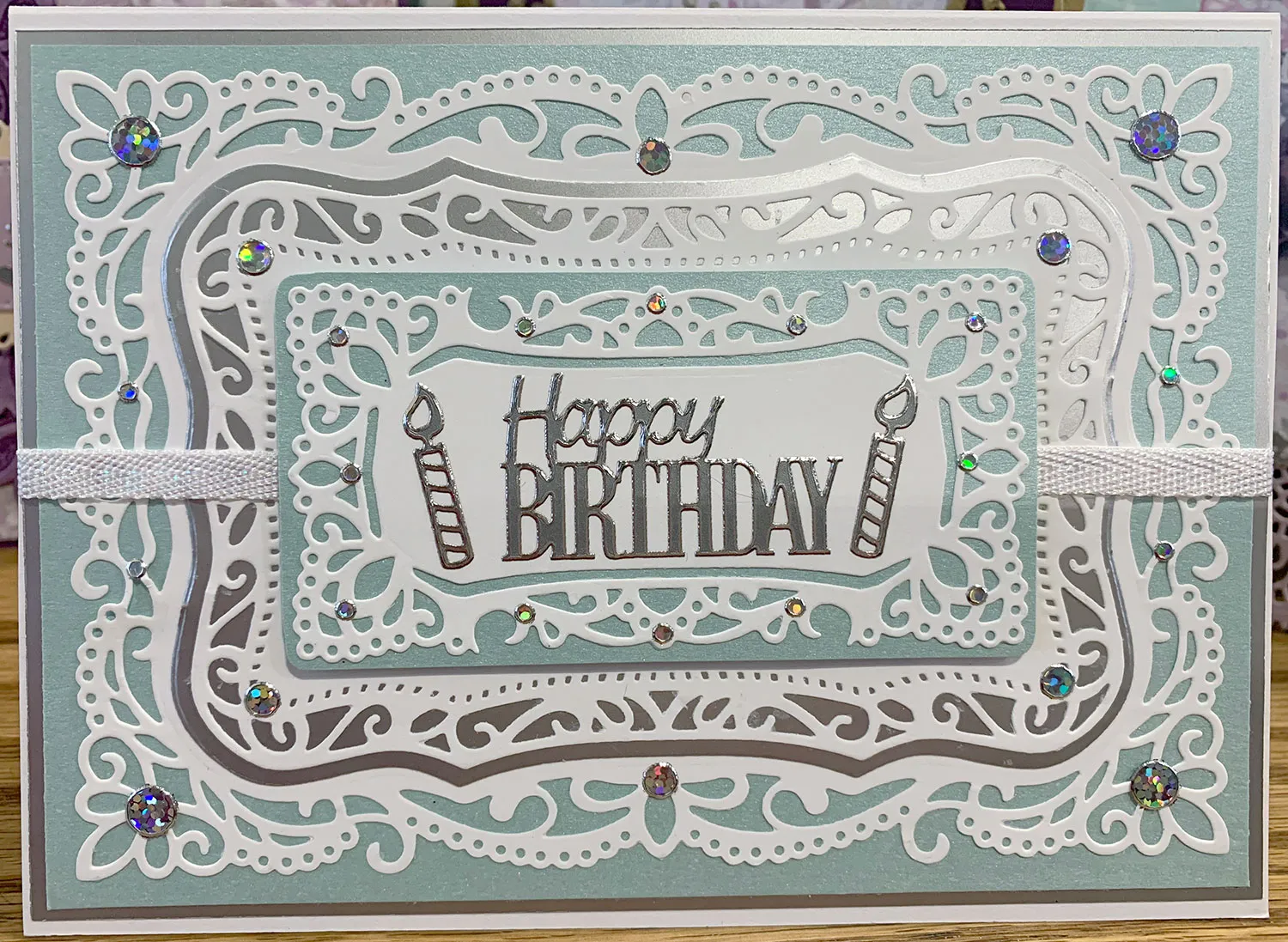 Die cut a 4 7/8"x3 1/8" frame from Mint Pearl cardstock and a 4¾"x3" frame from white cardstock. Glue the white frame to the Mint frame, then glue both centered on the inside. Place silver “the more candles the bigger the wish” Dazzles™ as shown.