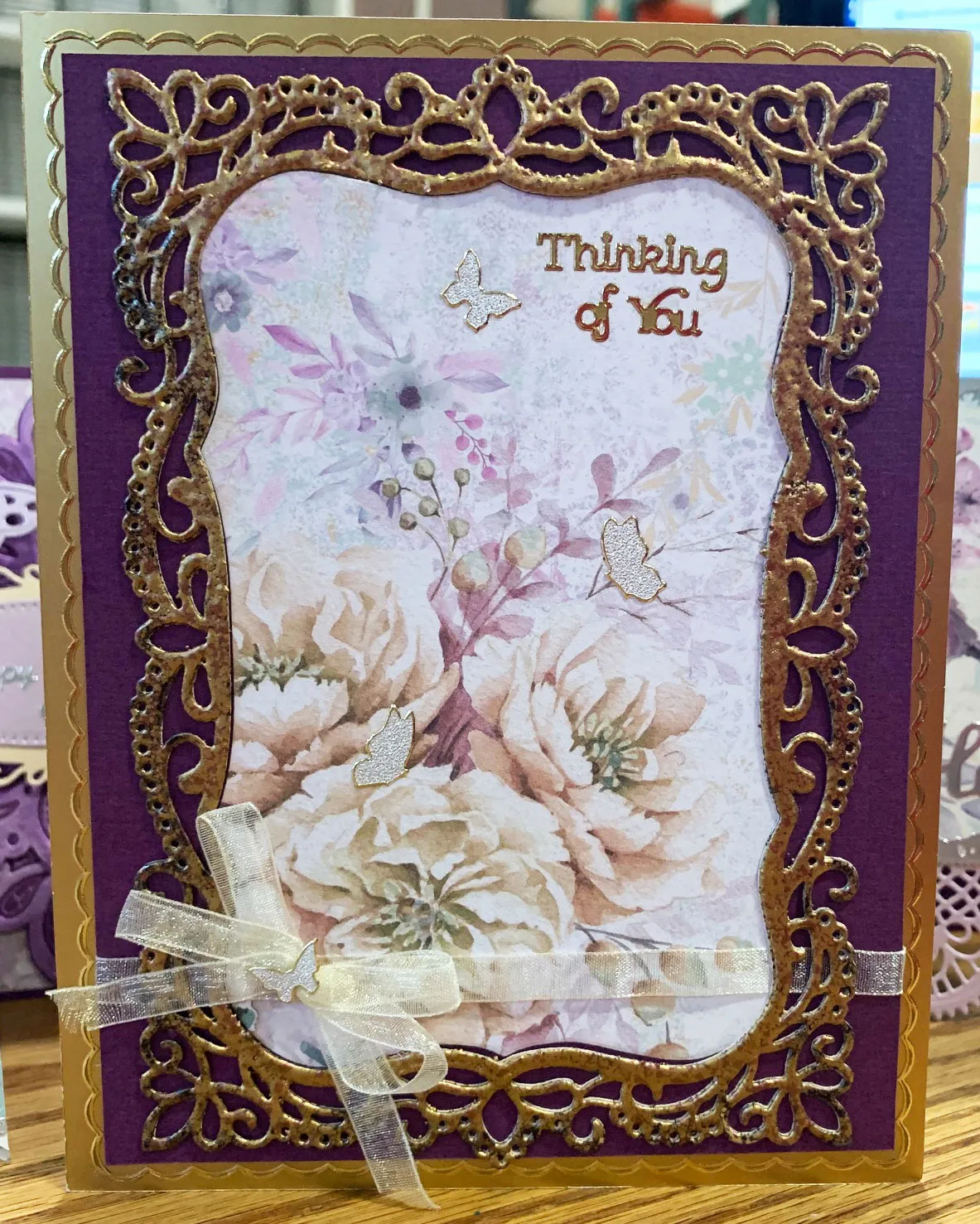 Place gold “thinking of you” Dazzles™ on the floral frame at the upper right. Glue a butterfly Dazzles™ to the bow center, then place three more butterflies on the floral panel as shown. Place gold scalloped thin line Dazzles™ around the outer edge of the purple cardstock, trimming the excess.