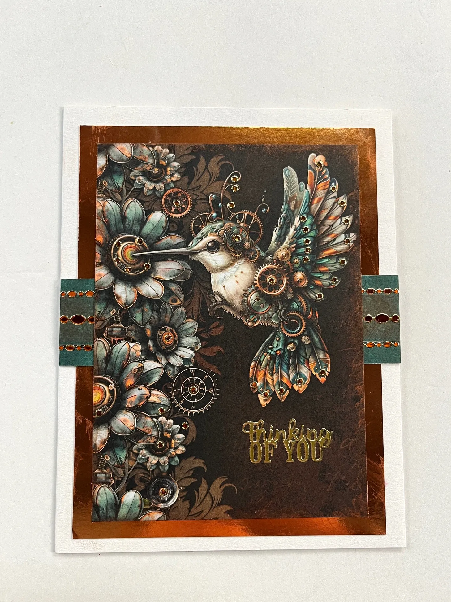 3. Cut 4 ½”x6” copper Mirri cardstock and glue to the card. Use extra sticky tape to attach the hummingbird with strips to the card. Place gold “Thinking of You” We’re Together Dazzles™ on the lower right. Use the jewel picker to place small copper Jewel Dazzles™ on the bird and on the gears as shown.