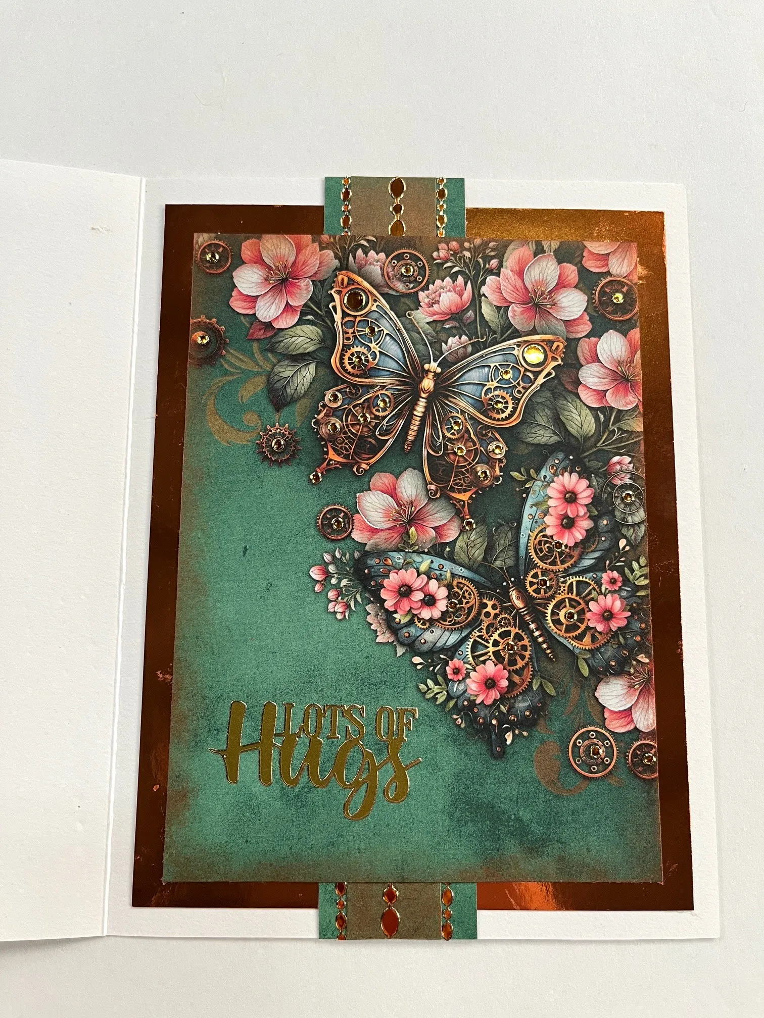 6. Cut 4 ½”x6” copper Mirri and glue to the card. Use extra sticky tape to attach the butterfly with strips to the card. Place “Lots of Hugs” from we’re together Dazzles™ at the bottom left. Use the jewel picker to place medium and small copper jewel Dazzles™ on the butterfly and flower gears.