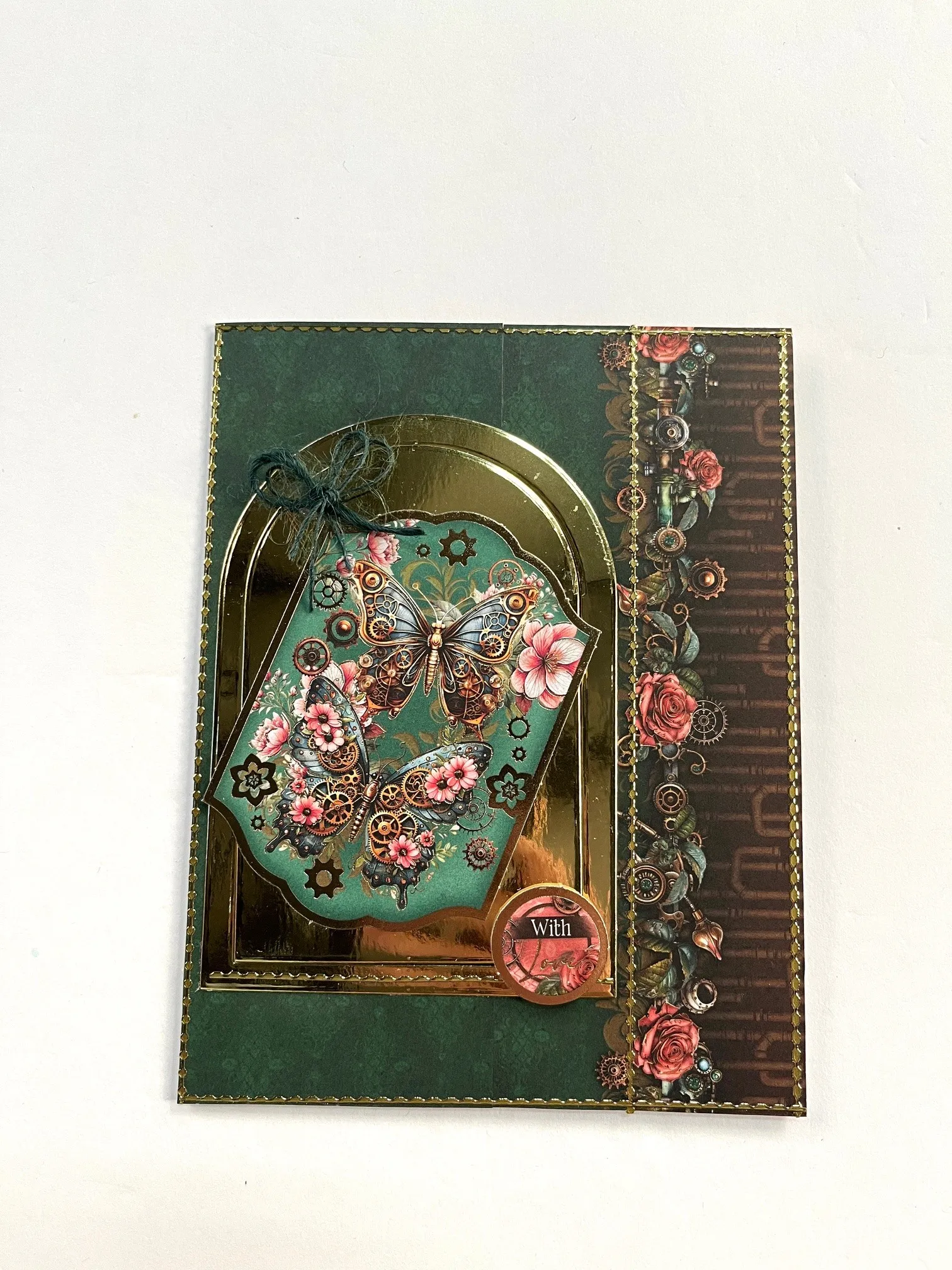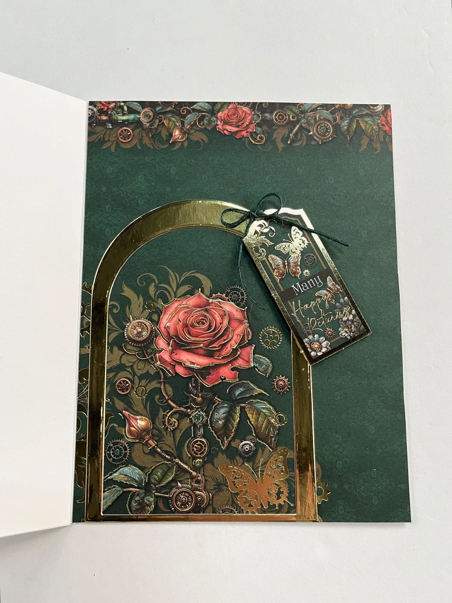 5. Inside: Cover the inside with the rose foiled Adorable Scorable. Use the low tack tape to attach both arch dies as shown and cut from gold Mirri. Then glue to the card over the rose art. Foam tape the “Many Happy Returns” foiled tag at an angle. Zot™ a single strand green jute bow at the top of the tag.