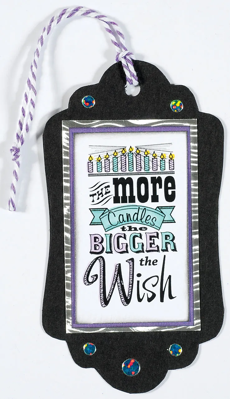 Stamp Birthday Cheer “The More Candles…” onto Silky Papers and color with BT4 Turquoise, LV1 Purple and CT2 Yellow Spectrum Noir Pens as shown. Cut paper to 1 3/4”x2 3/4” and ink the edges black. Mat with lavender Princess Cardstock, leaving 1/16” border. Foam tape on 2”x3 1/4” Silver Holographic Ripple paper and glue to the tag center.