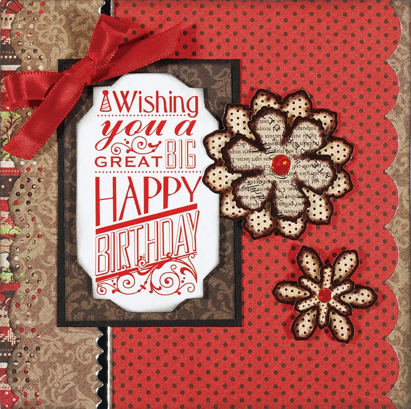 Stamp Birthday Cheer “Wishing you a…” on white cardstock using Red ink. Trace with 15 Lovely Labels Template 1 3/4”x 2 3/4” Art Deco Label and ink the edges black. Foam tape to 2”x3 1/4” Red Velvet dark brown tapestry paper and mat with black cardstock, leaving 1/8” border. Glue to the left side of card as shown. Use 9” of 1/4” wide red Red Velvet Satin ribbon to make a bow and Zot to greeting as shown. Layer Typeset Layered Flowers with foam tape and place on the right as shown. Place Red Jewel Dazzles™ as shown.