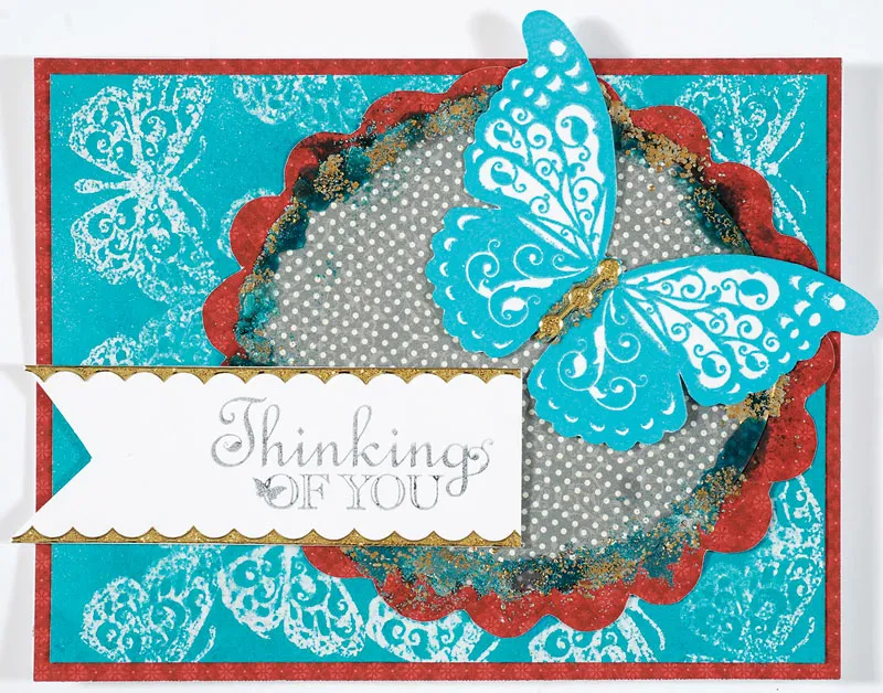 Card Front: Place card in front of you with fold at the top. Cover with Robin’s Red red patterned paper. Next cut a 4¾"x6¼” white cardstock. Take 2 ¼” butterfly from Butterfly Stamp set and stamp repeated pattern as shown onto white cardstock using VersaMark™ stamp pad. Sprinkle with Kaleidoscope embossing powder, shake off the excess and heat set. Spray with Vibrant Turquoise Dylusions Spray, and pat dry with a paper towel. Let dry. Glue centered onto your card front.
