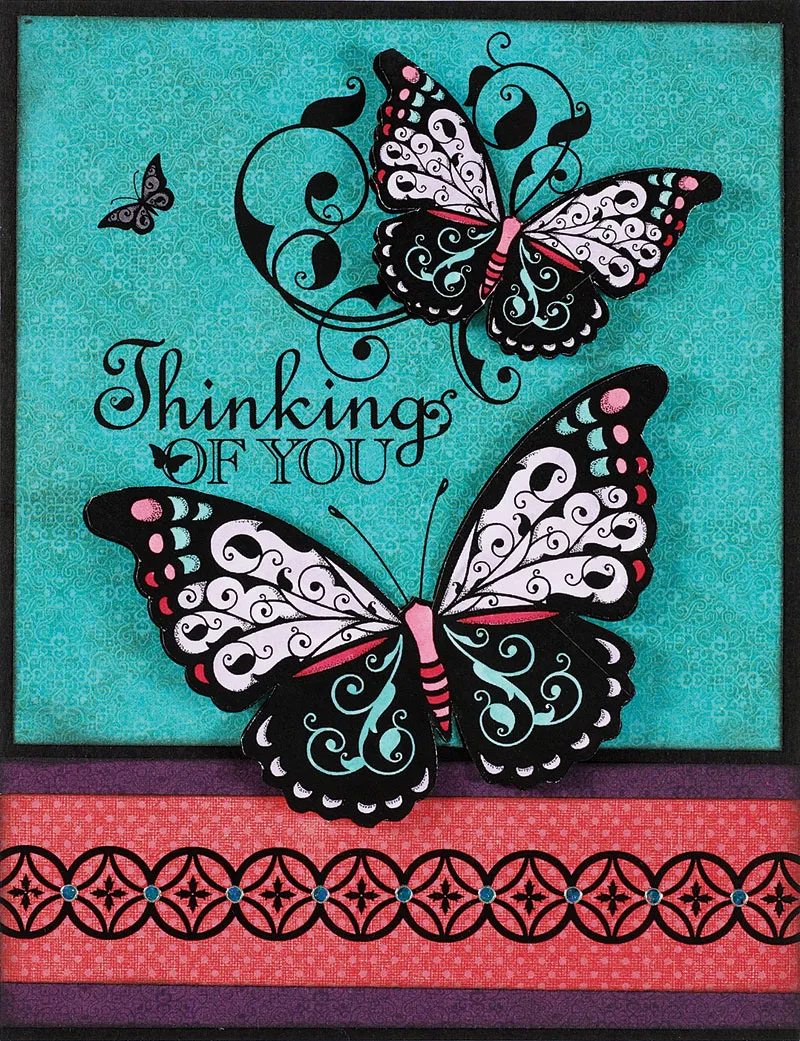 Stamp the Butterflies large and medium images on Silky Papers and color with Spectrum Noir BT4 Turquoises LV1 and PL5 Purple and DR3 and PP5 pinks as shown. Cut out the images then glue and foam tape over the stamped images on the card. Color the small butterfly stamped on card with PP5 pink.