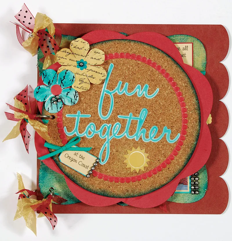 Add the inked Artisan Circle centered on the inked round cork page and press into place, making sure the hole in the cork is at the left side. Add “fun together” and the “sun” inside the circle. Foam tape the flowers near the upper left edge. Add the inked flower centers to the resist flowers. Write or computer print words on yellow cardstock. Trim to a tag shape and mat on teal cardstock with thin borders. Foam tape to the lower left edge of the red Artisan circle. Turn the cover over and use the cosmetic sponges to color back of the flower petals that extend beyond the cork.