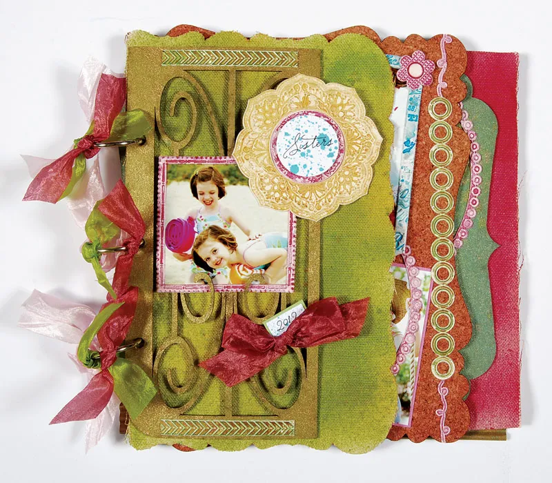 Place a framed photo centered on the swirls chipboard page, tucking it beneath the swirls as shown. Write or computer print “Sisters” and the year on white cardstock and lightly mist with True Turquoise. Punch a 1 1/4" circle so “Sisters” is centered on the circle. Foam tape centered on the Artisan element flower shape and place overlapping the photo. Trim the year to a small rectangle and mat on lime cardstock. Tie a bow with 3/4" wide mauve crepe ribbon and Zot™ to the lower right portion of the swirls chipboard page. Add year near the ribbon. Cut the chevrons border in half (misted kiwi) and add centered to the top and bottom of the swirls chipboard page.
