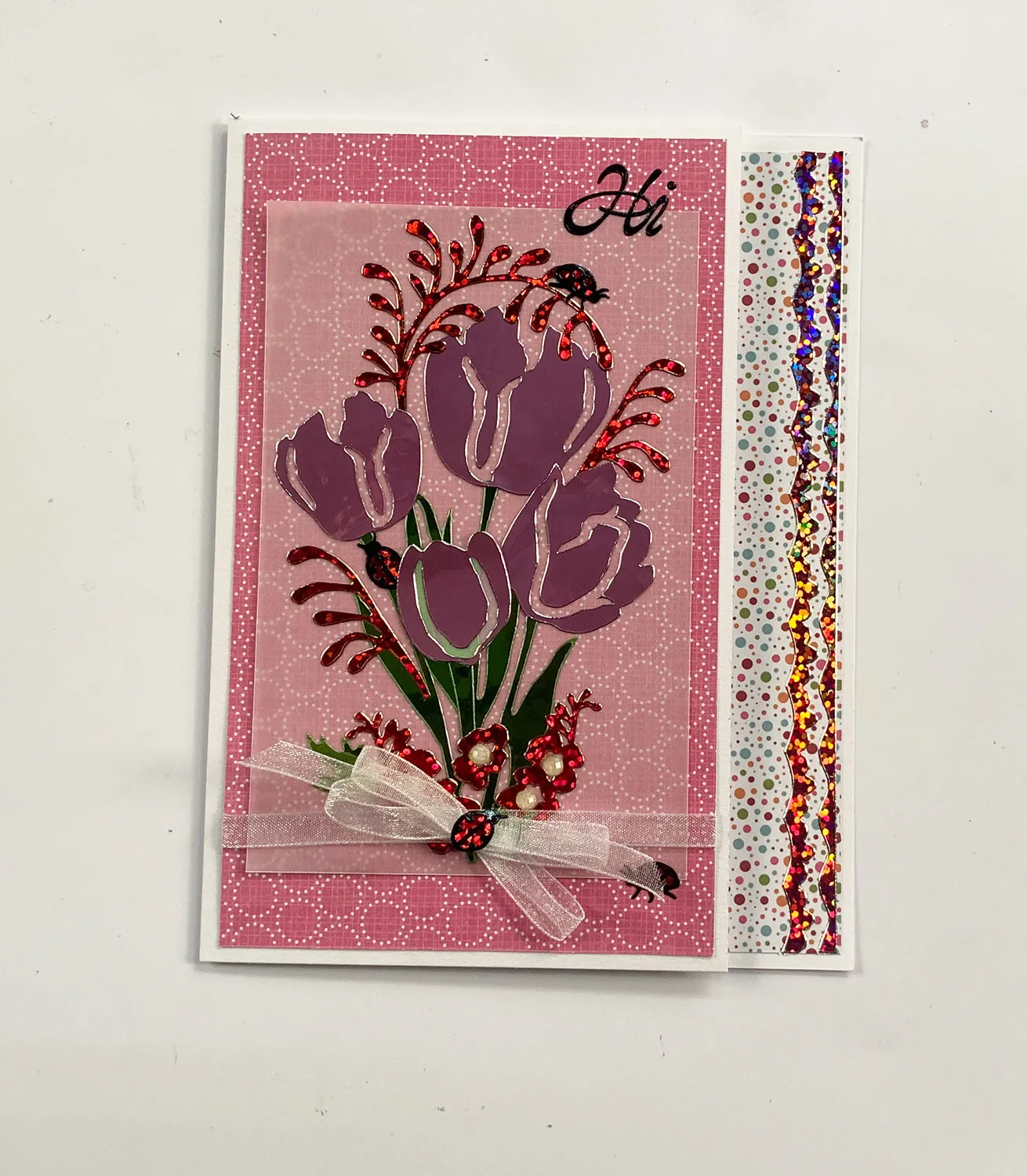 1. For the card front: Open the card and cut 1" off the right front edge, then close the card. Cut 3⅜"x5⅛" vellum. Refer to the photo to “build” a bouquet of tulips with three of the pink metallic Tulip, red Tulip, and light green Foliage Dazzles™ on the vellum. Place a 1" pink tulip blossom on vellum, cut around the edges, and glue to the front of the bouquet as shown.