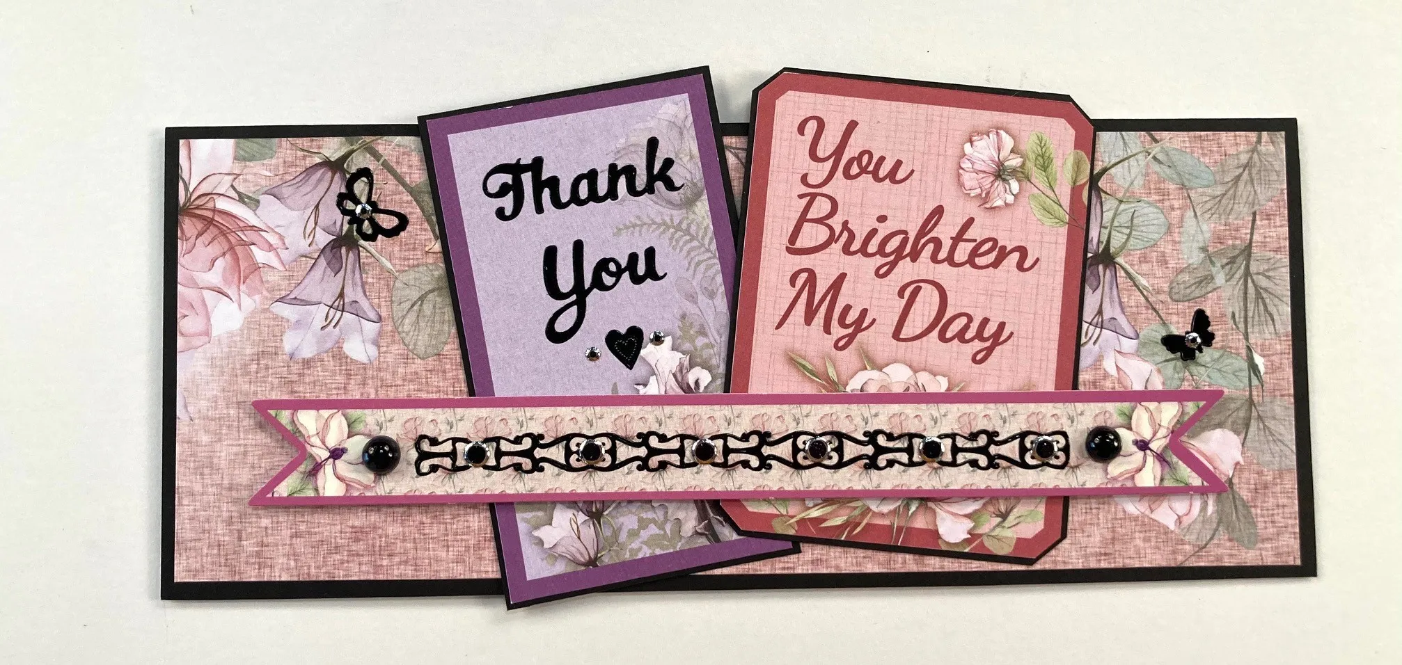 3. Foam tape the pink border die-cut across the front, ½" from the bottom. Place black border Dazzles™ across the die-cut center, trimming the excess, and a black pearl on each end. Place two small black butterfly Dazzles™ on the front as shown, then decorate them and the border with jewel Dazzles™.