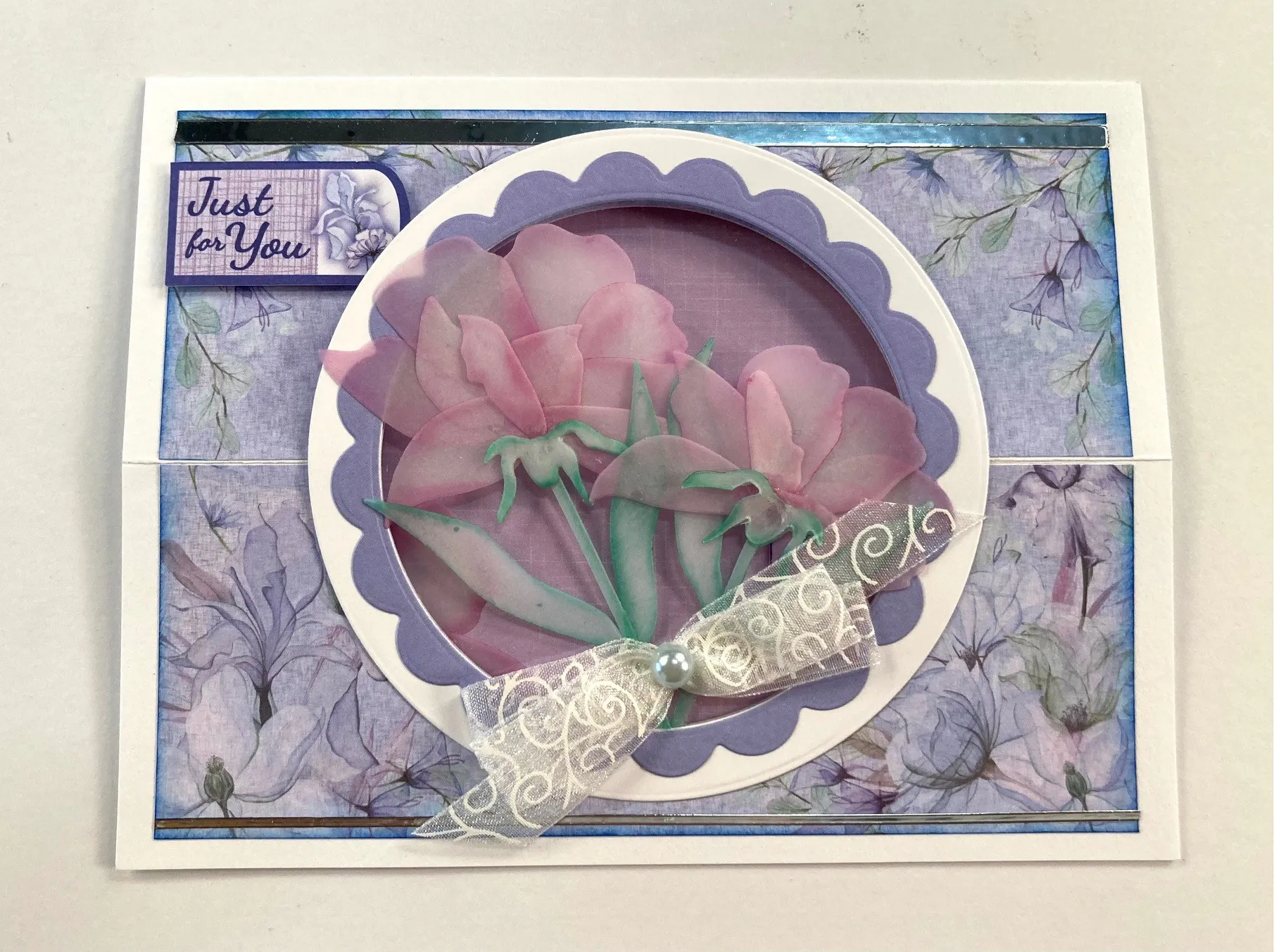 4. Make a 4-loop bow with swirl sheer ribbon and tie the center with thread, then lace a light blue pearl in the center. Glue the bow over the flower stems as shown. Cut out the “just for you” label and foam tape it in the upper left corner.