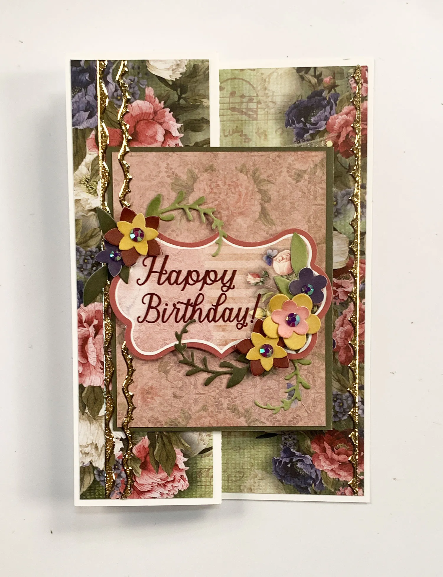 5. Place two border Dazzles™ on the front as shown, trimming the excess. Foam tape the “happy birthday” label die-cut on the front of the small card. Die cut flowers from yellow, burgundy, pink, and blue cardstock and leaf sprigs from green cardstock.