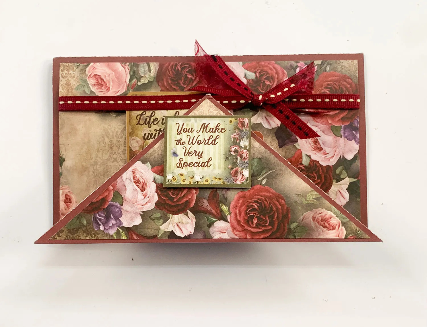 2. For the front: Cut 5¾"x3¼" Romantic Florals roses cardstock with the flowers in the upper right corner. Wrap a 7" length of ¼" wide burgundy/cream grosgrain ribbon across it, ¾” from the top, and glue the ends to the back.