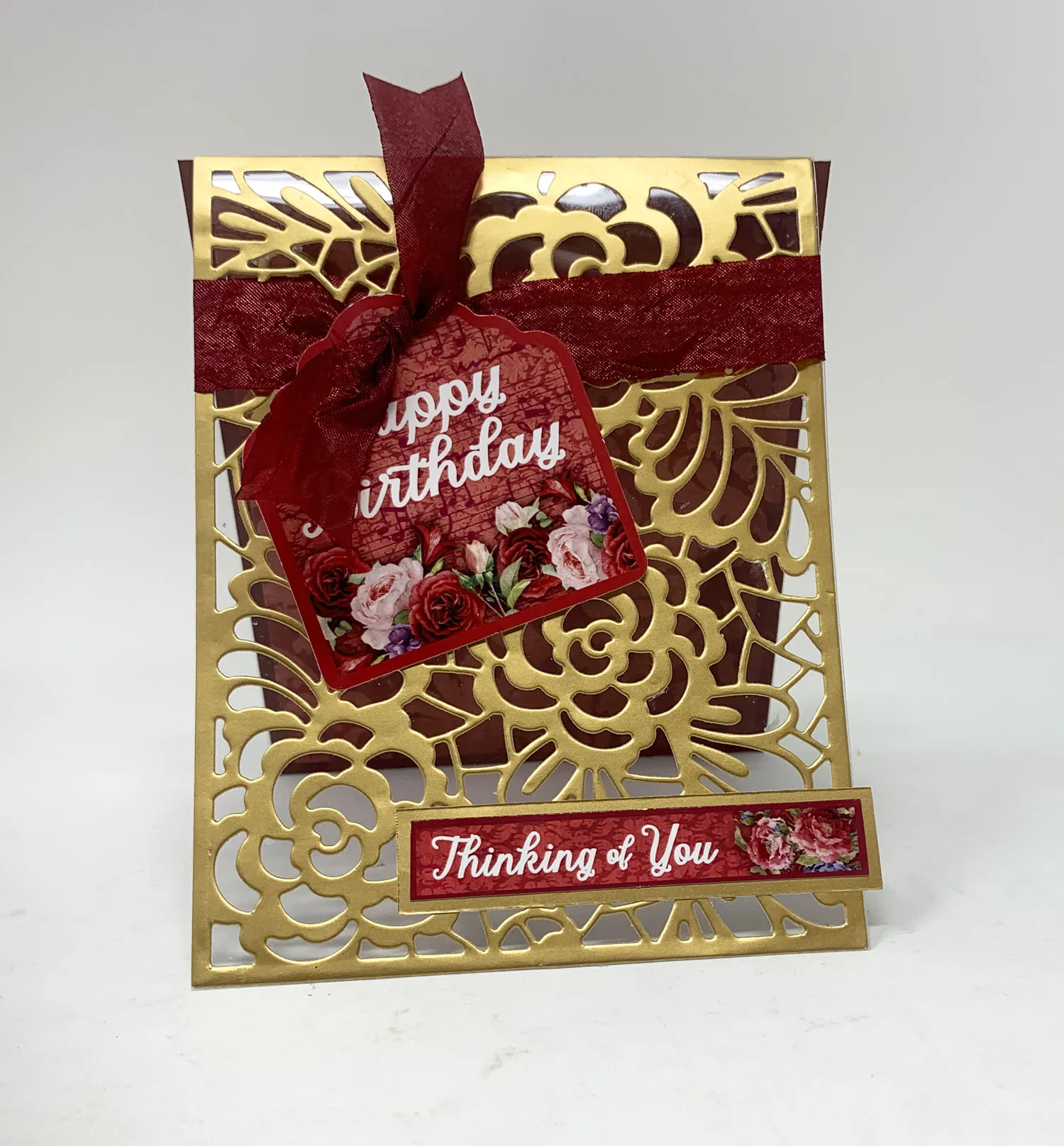 2. Wrap burgundy crepe ribbon around the front, ⅞" from the top, and thread both ends through the hole in the Romantic Florals “happy birthday” tag die-cut. Tie a knot on the tag front and position it near the left card edge. Trim the ribbon ends, then tuck foam tape under the tag’s upper right corner to secure it at an angle.