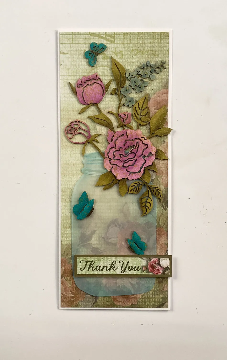 2. Attach the jar to the front, ½" from the card bottom, placing glue about 1" up from the jar bottom and at the upper right (so the glue will be hidden by the other elements). Cut out the Romantic Florals “thank you” label and foam tape it to the front at the lower right, covering the glue used to attach the jar.