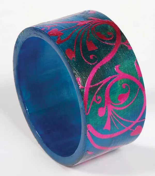 Use the surface of the inkpad to apply Ocean chalk ink to the surface of the bangle. Let dry, using the heat gun to speed up drying time. Use the cosmetic sponge to apply ink to the inside of the bangle.