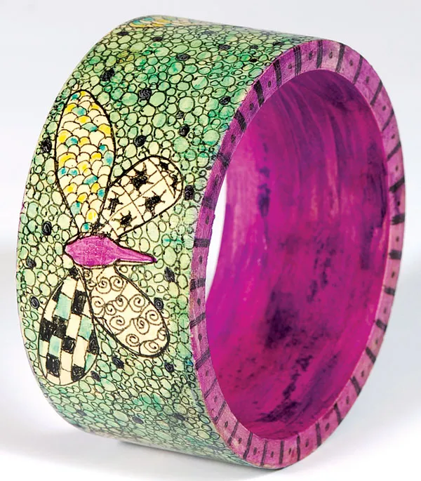 Spray the bangle with clear acrylic sealer in a well ventilated space. Let dry and color background with Turquoise BT4. Color the bangle body, edge and inside with Purple PL4. Use the Green CG2 as well as the Turquoise pen. Spray again with sealer and let dry.