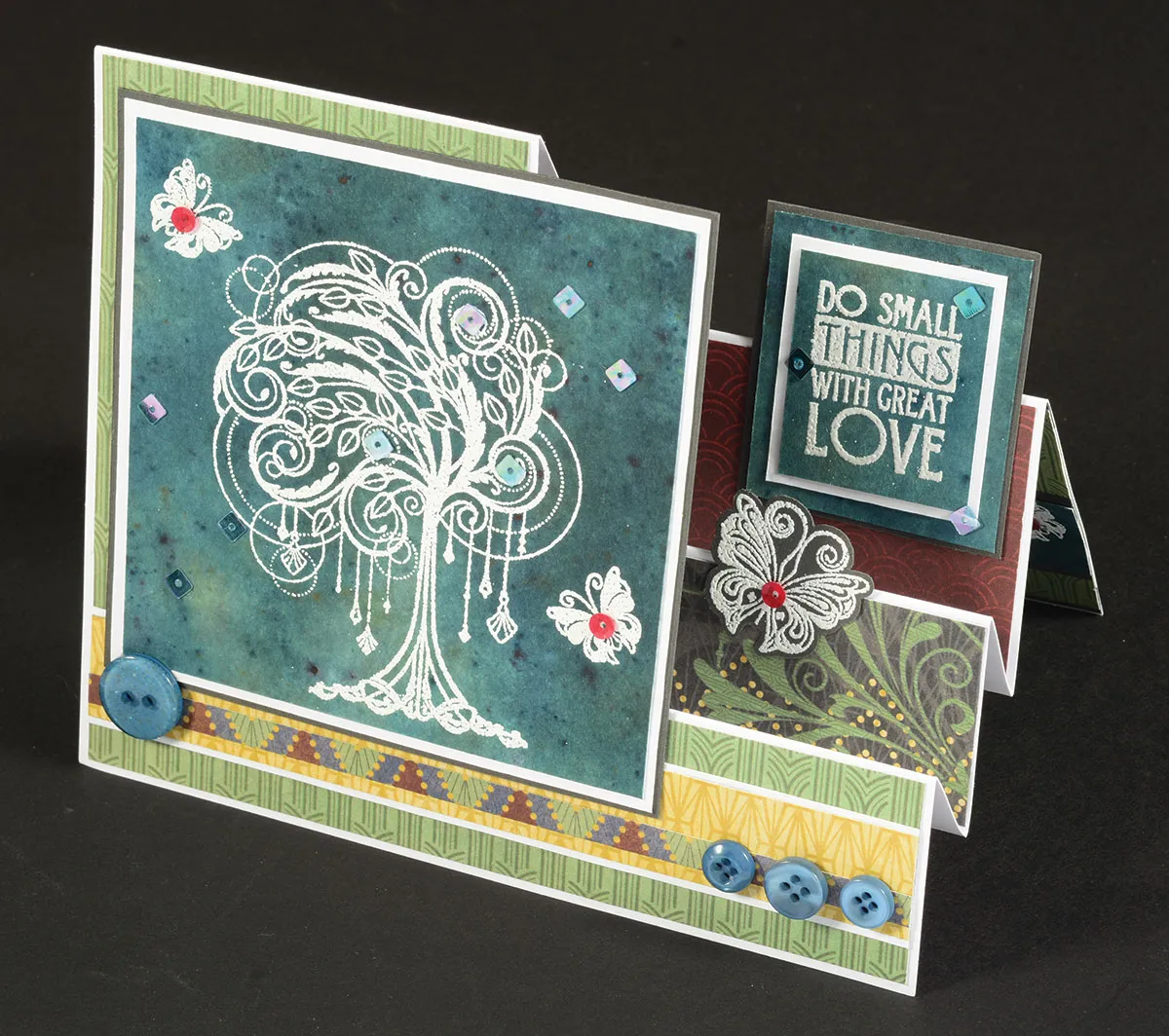 Rub the inked cardstock liberally with the crafting pouch. Cut 3¾" square of the inked cardstock then stamp the tree in the center. Stamp two butterflies near the tree as shown, then cover the ink with embossing powder. Tap off the excess powder and heat the remainder to melt it. Use double-sided tape to mat the square on white cardstock with 1/16" borders, then on gray cardstock with very narrow borders. Glue it to the front near the left edge.