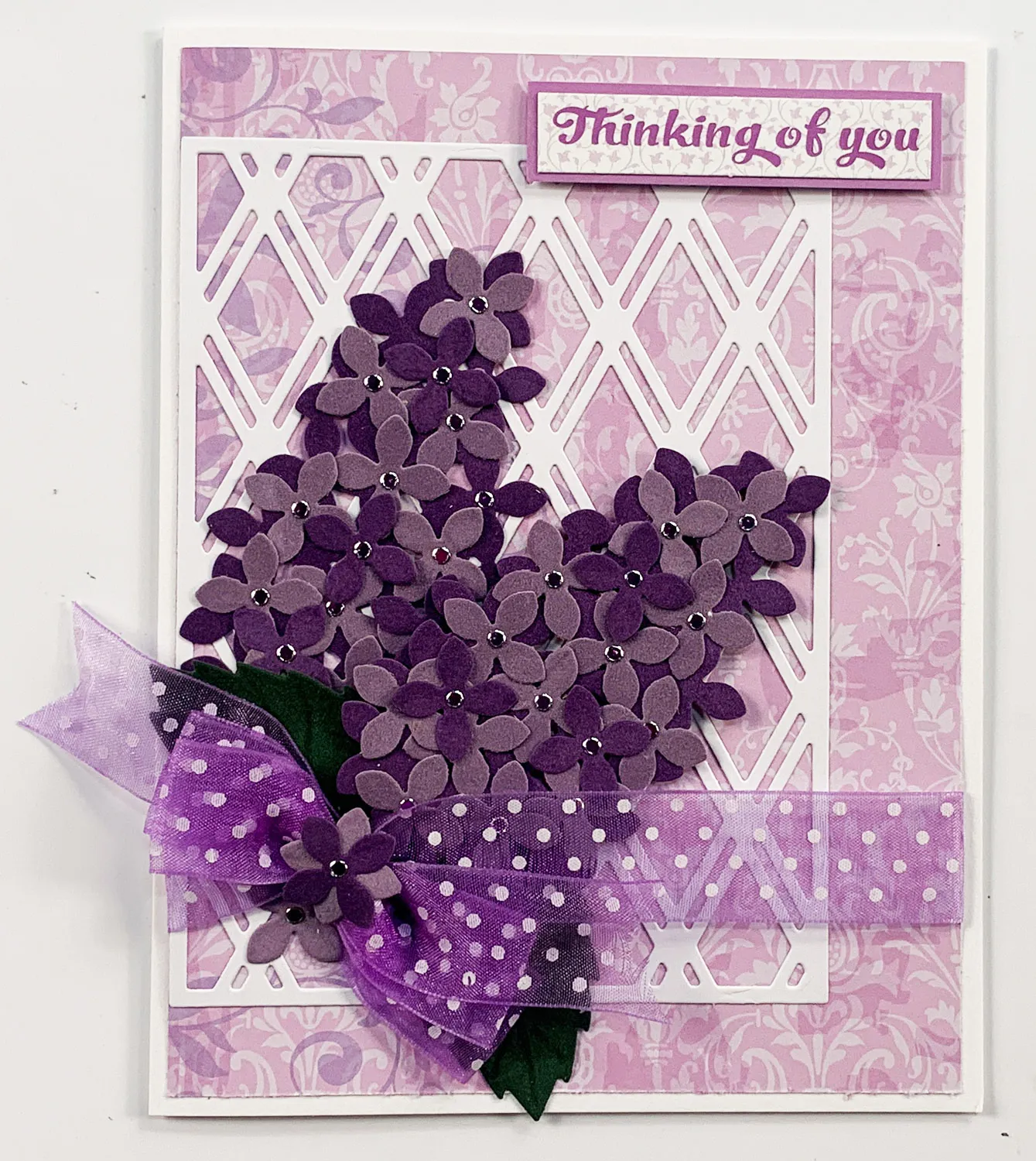 Punch out the “thinking of you” die-cut and mat it on lavender cardstock with 1/16" borders. Foam tape it at the upper right. Make a 4-loop bow with the same ribbon and tie the center with thread. Glue it over the first ribbon, covering the base of the right flowers. Glue single lilac blossoms over the bow center and just below it, then add jewel Dazzles™ to the centers.