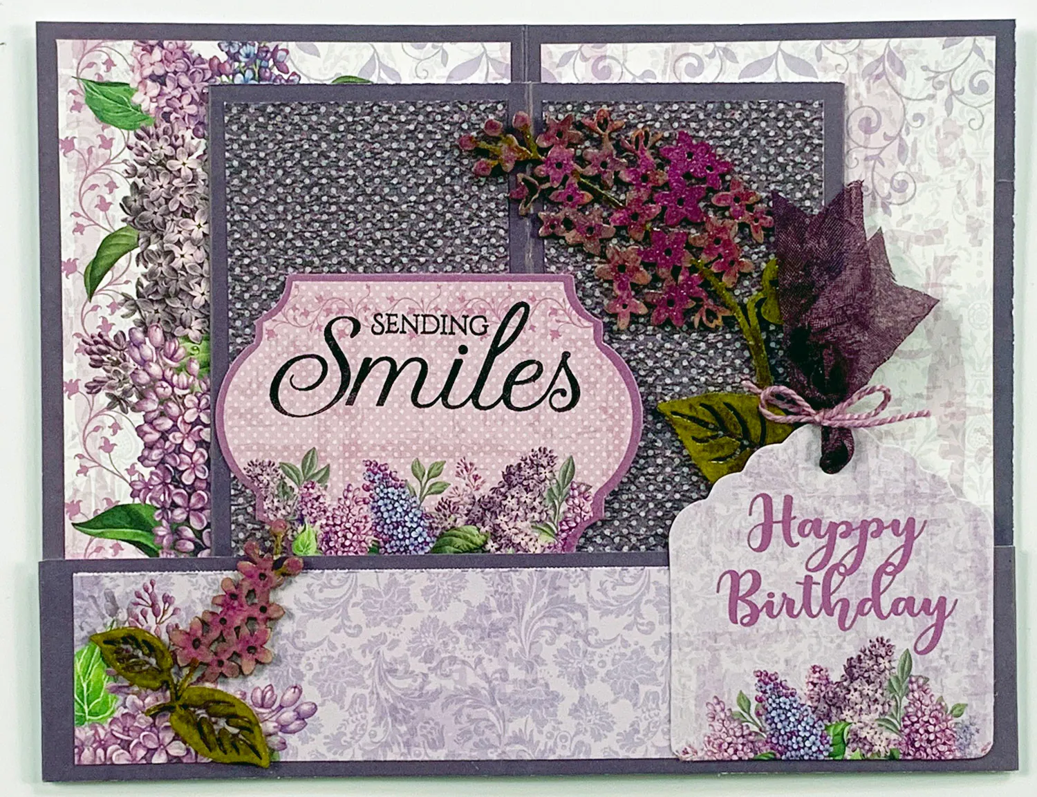 Punch out the Lilacs In Bloom die-cut shown and stamp “sending smiles” on it with Jet Black ink. Glue it to the left dotted panel so it extends over the center fold.
