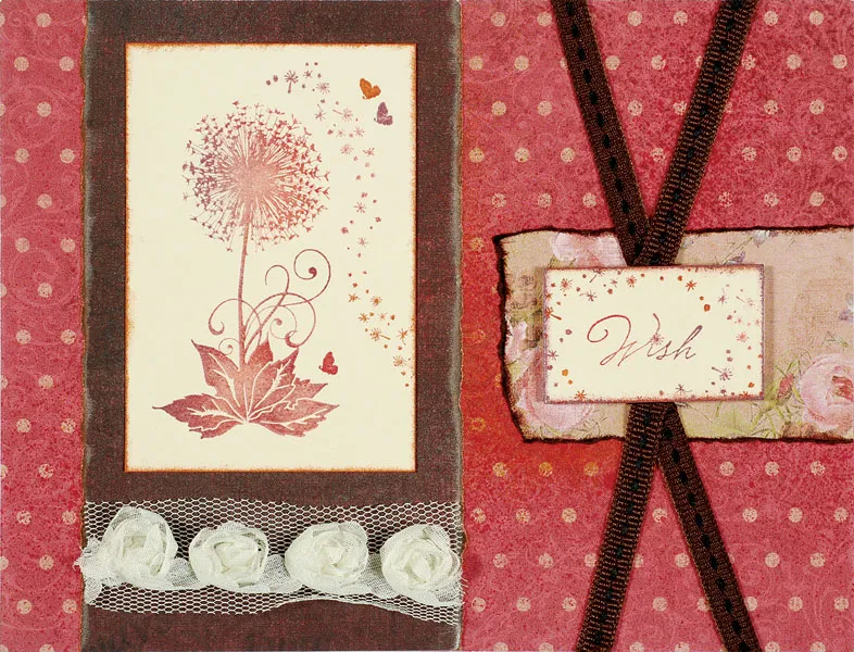 Inside the card: Cut a 6 ½”x5” rectangle from tan rose pattern, ink the edges brown, and glue to inside panel. Cut a 4 ¾”x5” pink dot rectangle with the right and left edges inked brown. Glue to the center. Cut a 4”x2” piece of cream cardstock and ink the edges brown. In the center of the cream piece, write “Hope all your ___es come true” (leaving a space for the Wish stamp). Stamp “Wish” in the space in crimson ink. Use the top of the dandelion to stamp alternating images of poppy and crimson dandelions framing the greeting. Glue the cream piece to the card, centered 1” from the top. Use Zots™ to glue 4” of small brown roses ribbon below the greeting as shown.