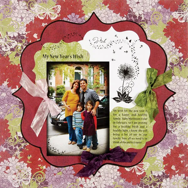 Glue a 4”x6” photo to the page, 2” from the bottom and 3” from the left. Stamp a couple dandelion sprays in the top right and bottom left corners of the photo. Glue bows of pink, purple, and green crepe ribbon at the left, bottom, and right of the main elements as shown.