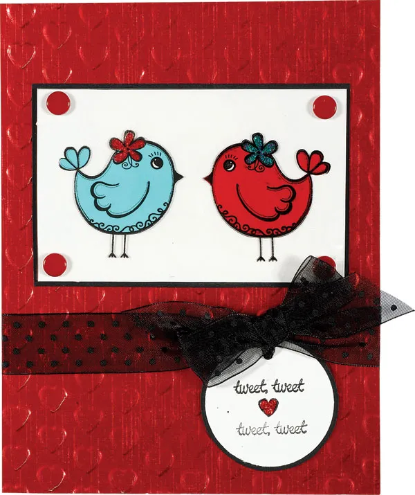 Inside the card: Cut a 5”x3” piece of red foil. Run it through the heart corrugator and glue it to the card, 1 ½” from the bottom. Cut a 4”x2 ¼” piece of clear overlay and use the technique in step 3 to create the two birds. When the paint is dry, apply a small amount of Aleene’s Tacky Glue to the backs of the birds and place on the card near the bottom. Make another circle tag like the one on the front. Stamp a small flower over the 1/8” hole at the top. Stamp “tweet, tweet” near the top and write “you’re sweet” under it. Stamp a small heart at the bottom and fill in with red Stickles. Let dry. Tie a knot in the top of the circle tag with 6” of sheer black dot ribbon. Foam tape the tag centered on the card, 1 ½” from the top.
