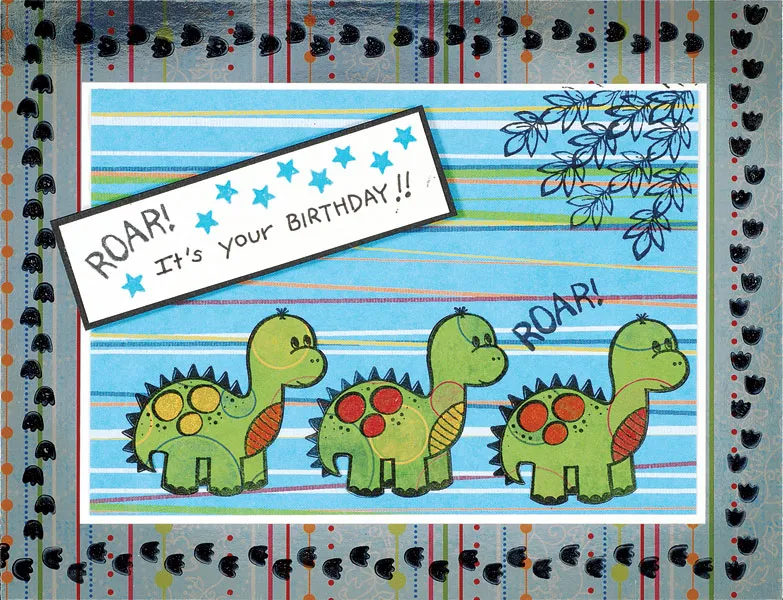 Stamp 3 dinosaurs in black going across the bottom of the blue rectangle. Stamp another 3 dinosaurs onto green circles paper. Color in the dinosaurs’ spots and bellies with siren red, pumpkin, and gold lame Smooch Inks. Cut out the green dinosaurs (you don’t have to cut around the spikes) and glue on top of the stamped dinosaurs on the card. Stamp “Roar!” between the second and third dinosaur. Stamp black leaves in a branch arrangement at the top right of the card as shown.