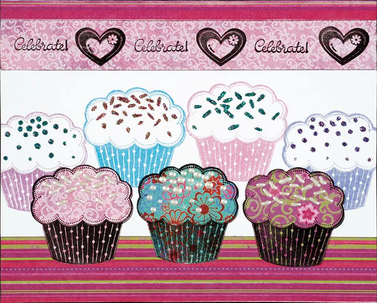 Stamp 4 cupcakes in the white part of the card, one each of the following colors: purple, sky blue, orchid, and lavender. The side cupcakes will go off your card slightly. Stamp one cupcake in black ink onto each of the following papers: pink pattern, teal flowers, and purple floral. Cut out each cupcake and glue to the card in front of the row of 4 cupcakes. They should overlap the background cupcakes.