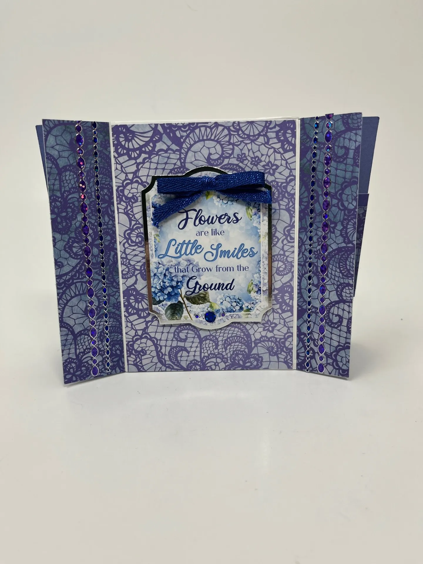 Cut two 1”x5” purple Luscious Lace strips for the sides and 3 1/2”x5” lighter Luscious Lace then tape to the card front keeping clear of the scores. Foam tape “Flowers are like…” Topper from the “Hydrangea’s from the Heart” sheet to the center. Place blue and purple oval Dazzles™️ on the strips and blue and purple jewel Dazzles™ on the topper. Make and Zot™️ a 2” wide glimmer bow from the Blue Ribbon Set and place at the top of the Topper.