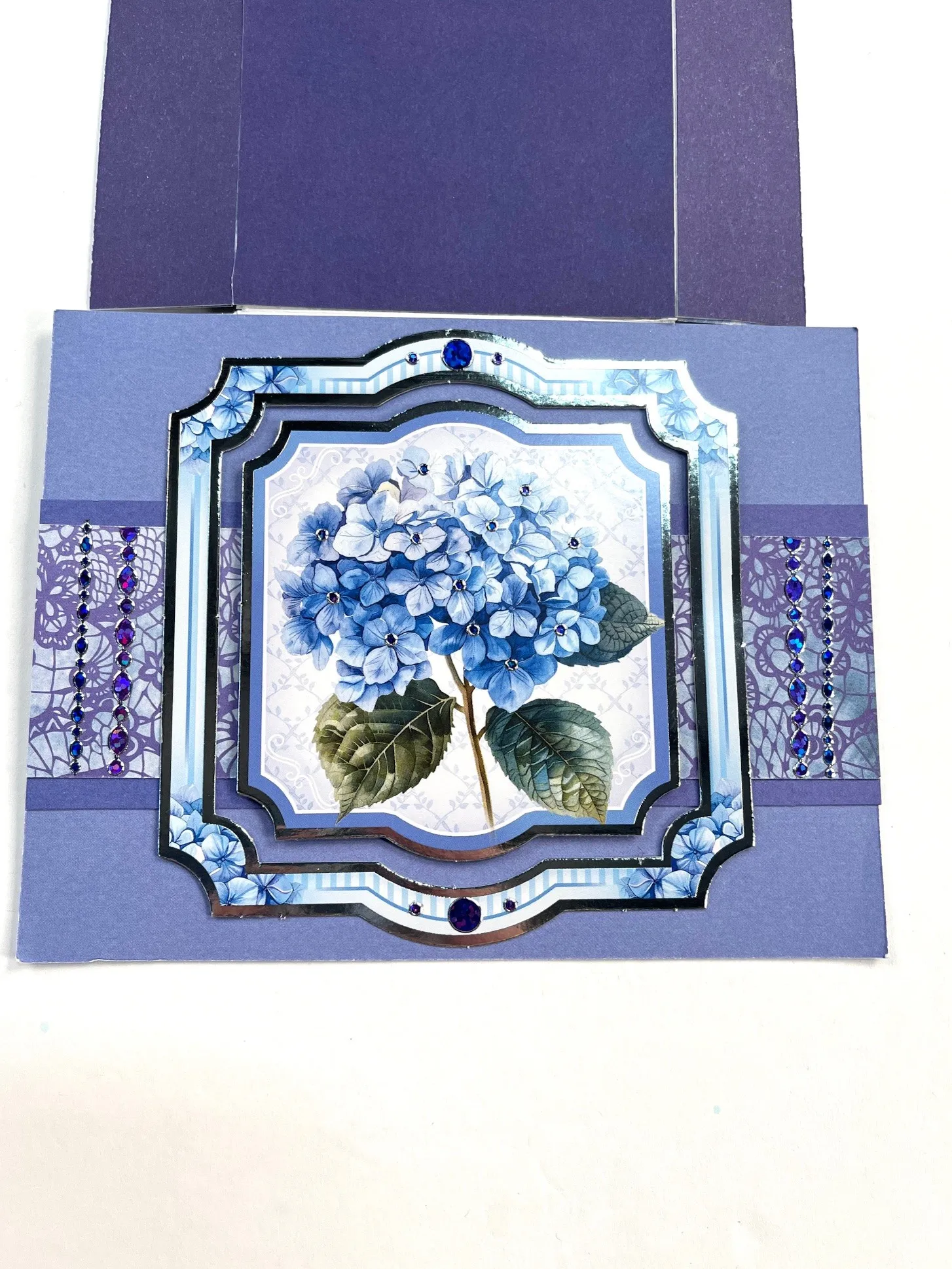 Cut a 6 1/2”x2” medium purple Luscious Lace Patterned Cardstock. Mat on purple Solid with ¼” borders. Glue to the card center. Take the large hydrangea Topper and remove the center frame. Foam tape the outer frame to the card and foam tape the center hydrangea Topper back in place. Place oval and jewel Dazzles™️ as shown.