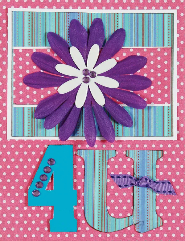 Apply ink to the edges of the “4” and add crystal stickers. Foam tape to the bottom left. Cover the “U” with striped paper and ink the edges. Glue a knotted ribbon length and glue the “U” to the right of the number.