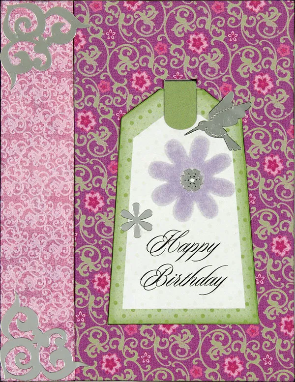 Ink edges of green/ivory tag. Write or computer print "Happy Birthday" near the bottom. Attach a Double Stick flower to the tag, off center above the words. Flock the sticker with lavender flock, shaking off the excess. Glue the tag to the card front as shown. Add humming bird and flower stickers. Add corner stickers to left corners of the card.