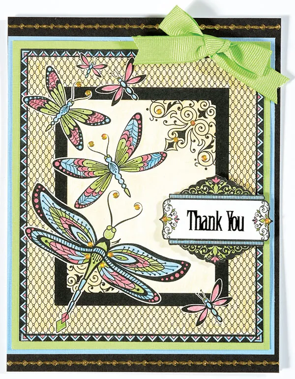 Cover the blank card with black cardstock and place with the fold on the left. Trim the Zen Dragonflies Colorist image at the edges. Color in the wide border and center corner swirls with #183 yellow pencil. Color in the dragonflies and thin outer border with the remaining pencils as shown. Use a wet paintbrush to spread the color in the spaces. Use your brush, water, and the #183 pencil to create a light yellow wash and paint it on the center space around the dragonflies. Let dry.