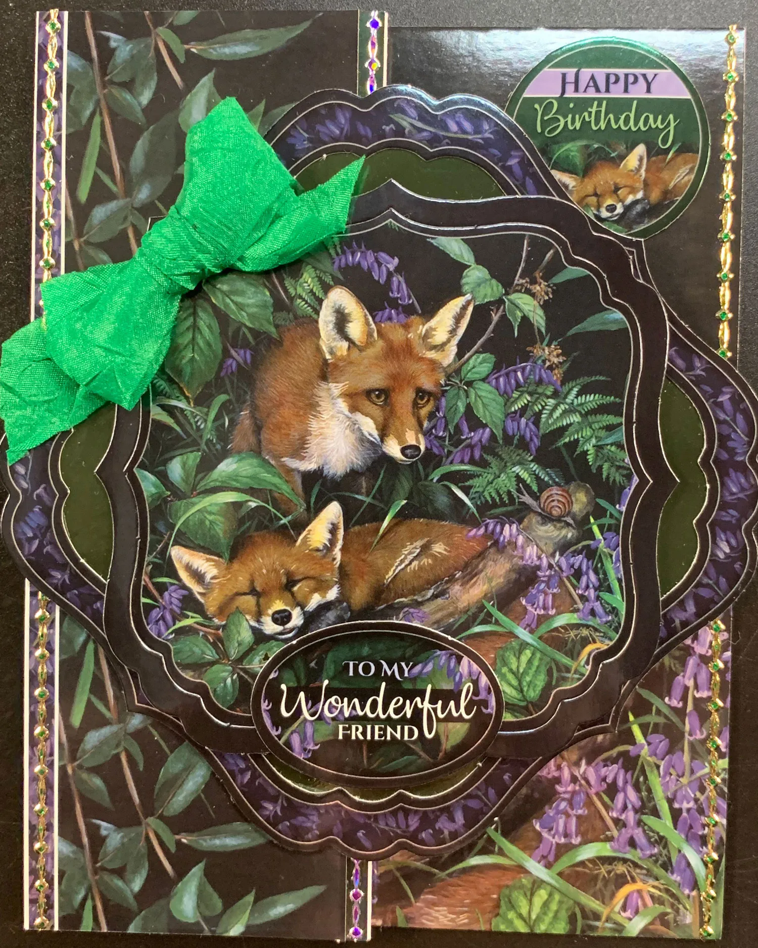 Take the large framed foxes topper and separate the pieces. Glue the large frame on the green area of the water lilies Adorable Scorable and trim to fit. Turn on point and glue only the left half to the front section. Foam tape the inner image and its frame to the center. Glue the sentiment to the bottom of the foam taped image. Zot™ a 2” bow to the left center edge of large image.