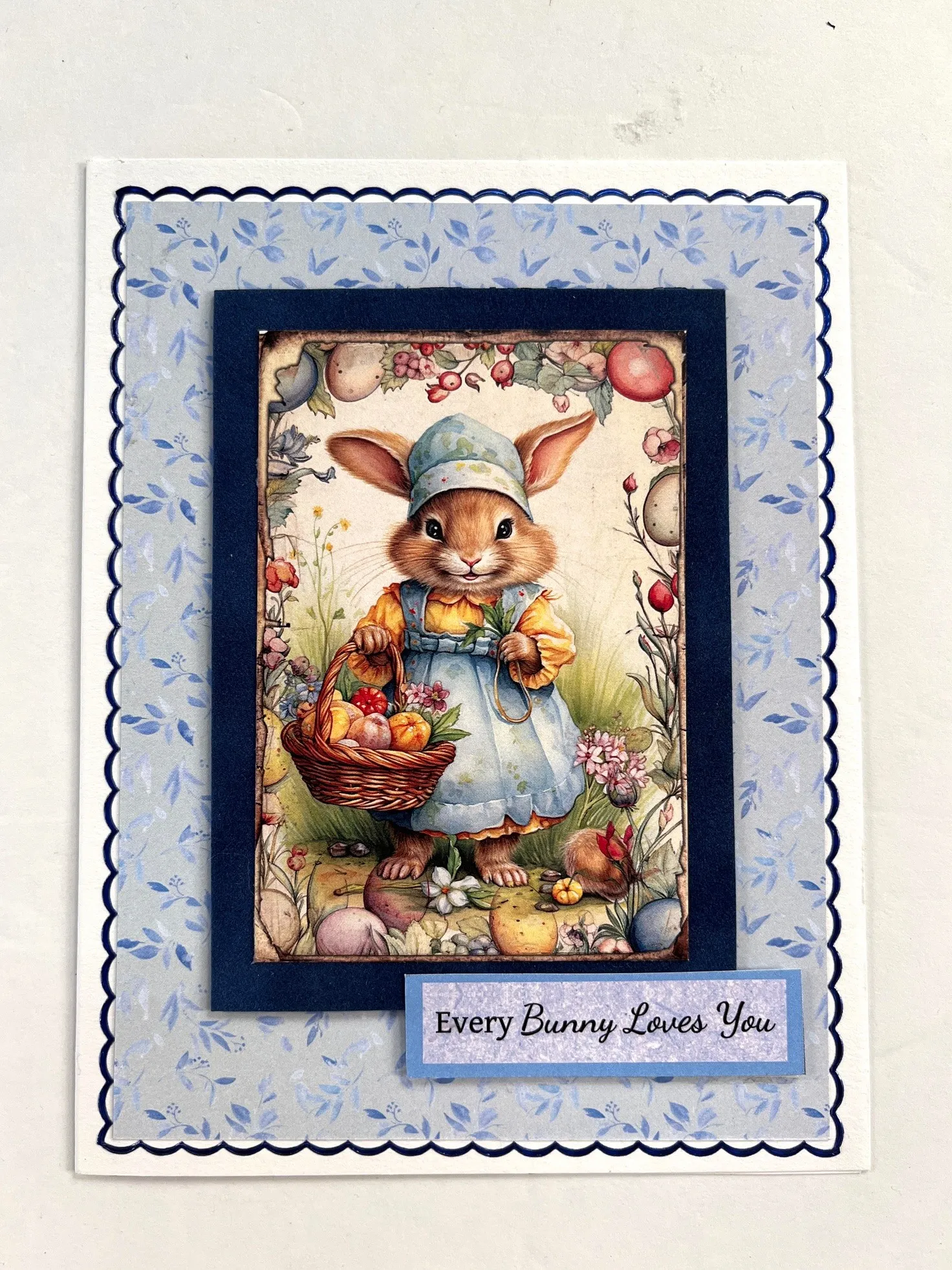 1. Cut 4 ½”x6” light blue Bunnies & Baskets paper then glue to the card front. Cut out the bunny with a blue dress and hat then mat on ocean suede with ¼” borders. Glue to the center of the card.