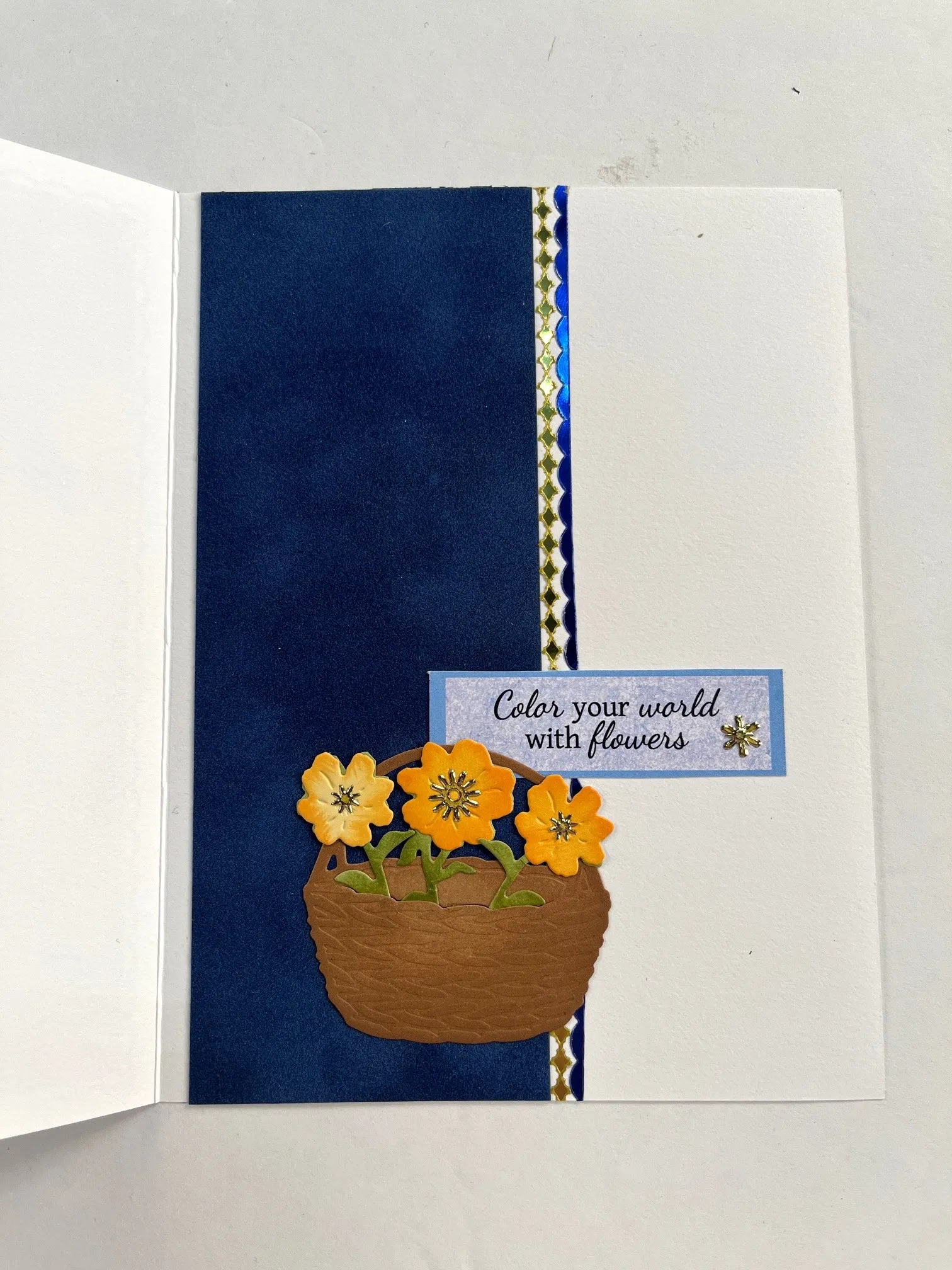 5. Glue the flower stems into the cut in the basket and glue to the card. Glue flowers to the matching shapes. Add tiny gold flower Dazzles™ to the center of each flower. Cut and glue “Color your world with flowers” greeting as shown and add a flower Dazzles™.
