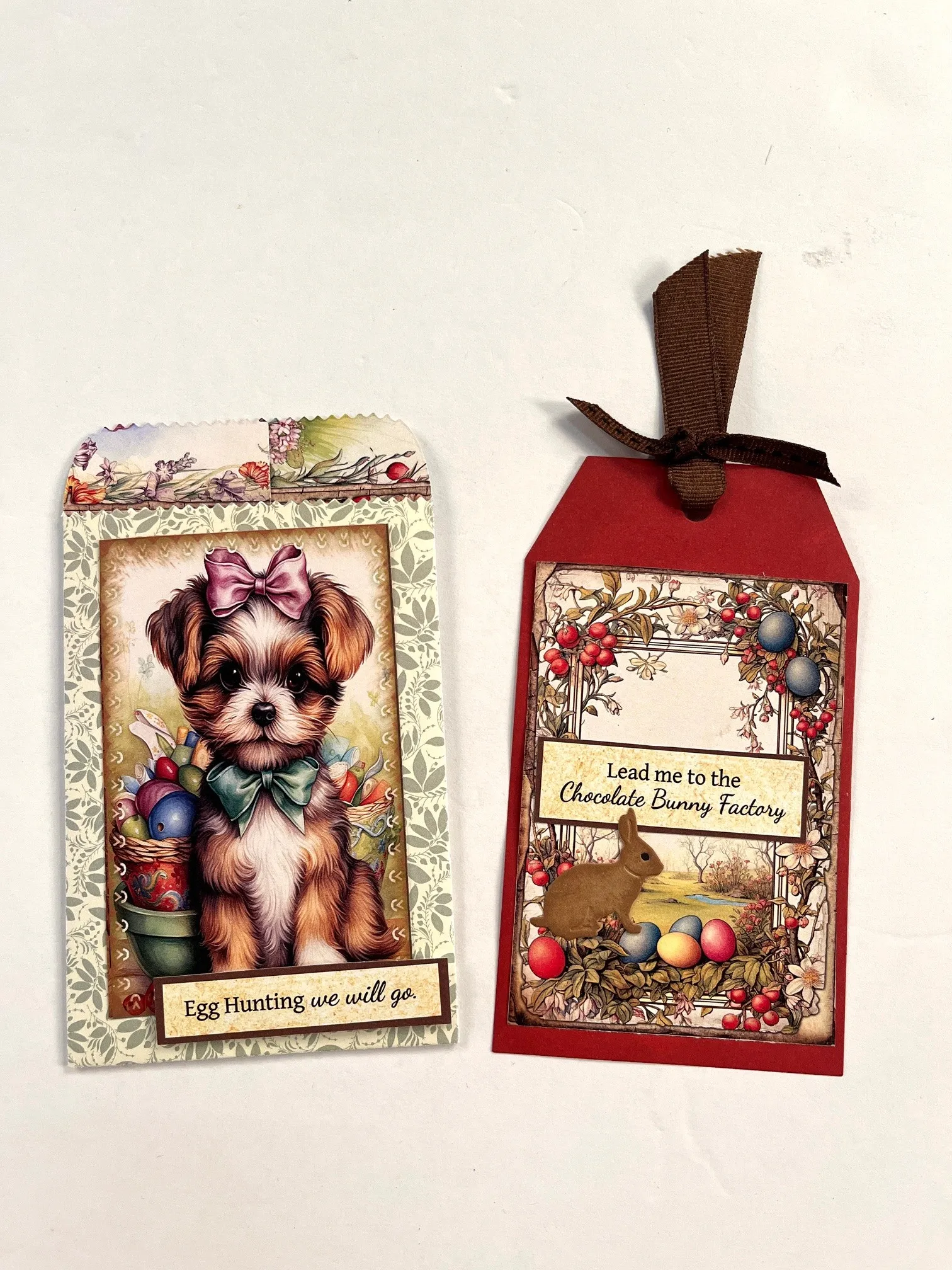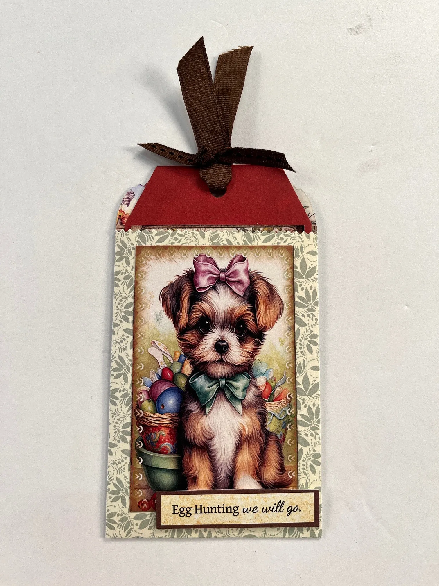 3. Use the tag die with burnt red Tulip Parade Solid Cardstock. Cut out the frame cutout that’s on the same sheet as the puppy. Ink the edges with velvet fawn and glue to the red side of the tag. Cut out “Lead me to the chocolate bunny factory” and ink the white area. Glue to the center of the frame.