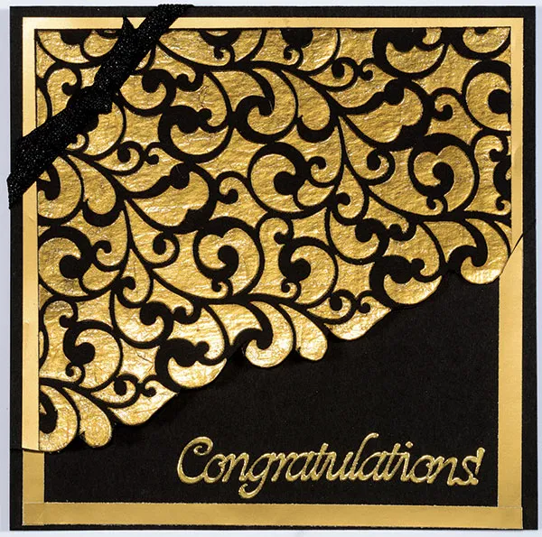 Find a line across the bottom of the card, following the lines of the stencil. Mark your line with pencil to make it easier to follow while cutting. The line should be a gradual angle from left to right. Cut through all layers of the FRONT ONLY, along the gold paste. Zot™ a black metallic ribbon across the top left corner. Zot™ a knot in the center.
